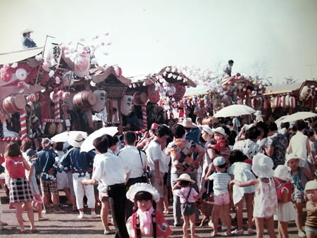 立川諏訪神社の例大祭の日、立川第三小学校の校庭に錦町の5台の山車が集まったところです。左から、錦みよし会、錦東会、立川錦囃子連、錦東和会、錦二の中町会の山車です。当時はどの山車もトラックを改造し、丸太や角材で手作りした山車でした。錦みよし会はやし連は、この13年後に発足しますので、錦みよし会の山車では八王子の追分囃子連さんが演奏しています。