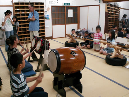 内容は、最初の30分間は笛のみの練習、次の1時間が太鼓の練習、