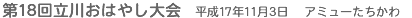 平成17年11月3日(木)文化の日、午前10時から午後5時までアミューたちかわ(立川市市民会館)小ホールにおいて第18回立川おはやし大会が開催されました。