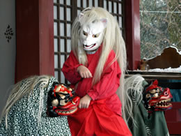 2月3日(日)雪が降る立川諏訪神社で節分の豆まきが行われました。豆まきの合間に神楽殿において錦東会はやし連が重松流祭囃子を披露しました。